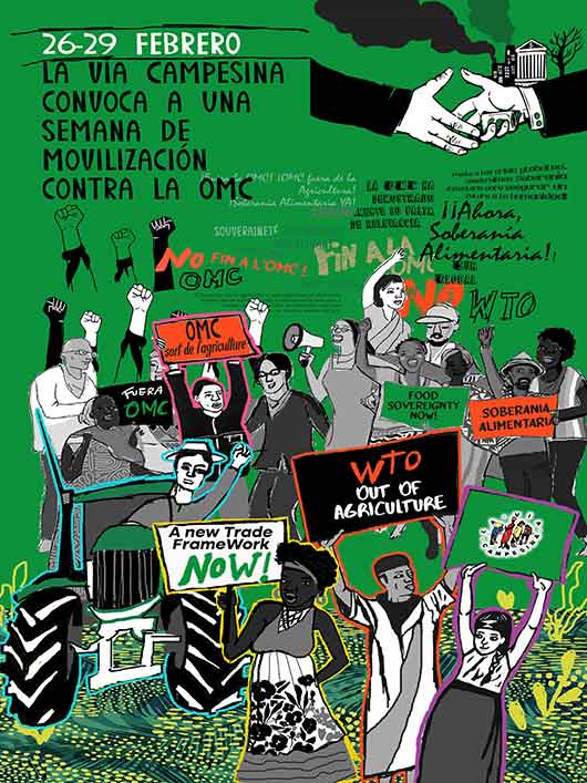 A medida que comienza la 13ª Reunión Ministerial en Abu Dhabi el 26 de febrero, La Vía Campesina insta a sus miembros de todos los países a salir a las calles y movilizarse contra la OMC, exponiendo las políticas perjudiciales que ha impuesto en los últimos tres decenios. Nuestra lucha colectiva por el comercio justo, precios justos para los productos, una transición significativa hacia la Agroecología Campesina y la defensa de la tierra, el agua y los bosques constituye en última instancia una batalla contra el sistema económico neoliberal promovido por la OMC.