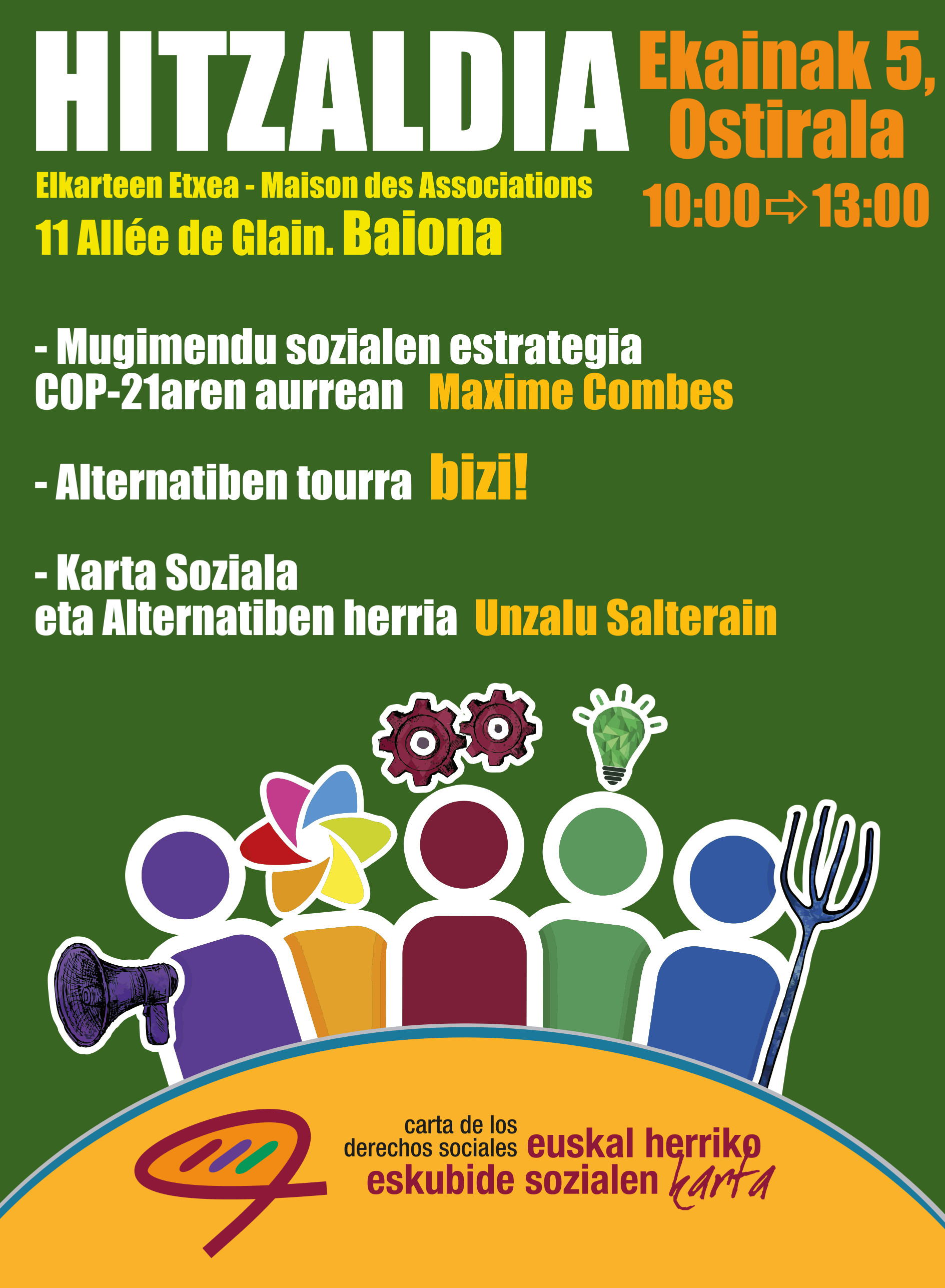 CHARLA/HITZALDIA: «MUGIMENDU SOZIALEN ESTRATEGIA COP-21AREN AURREAN + ALTERNATIBEN TOURRA + KARTA SOZIALA ETA ALTERNATIBEN HERRIXKA»
