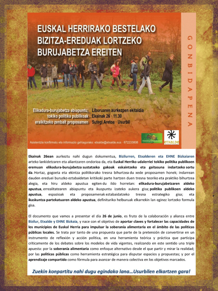 Invitación/Gonbidapena | «Euskal Herrirako Bestelako Bizitza-Ereduak Lortzeko Burujabetza Ereiten» |Documento por la Soberanía Alimentaria en el ámbito de las políticas públicas locales