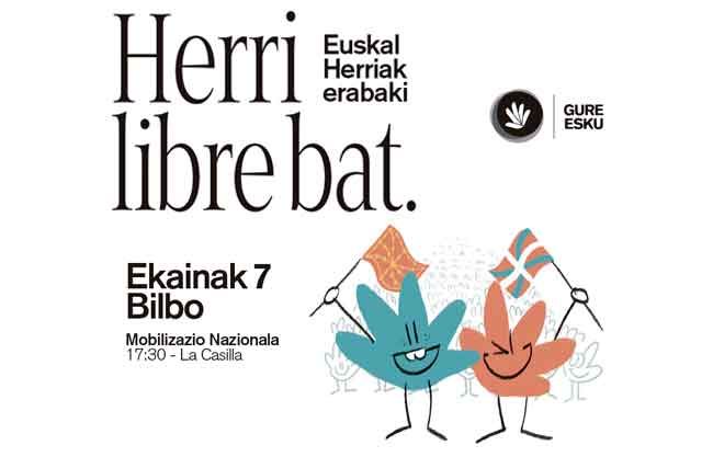 La movilización será el 7 de junio en Bilbao con el lema 'Un pueblo libre. Euskal Herria decide'. Su objetivo es conseguir la activación ciudadana en los debates sobre los nuevos estatus abiertos en los territorios de Euskal Herria. ELA, LAB, Steilas, EHNE, Hiru y Etxalde se han sumado a esta movilización de Gure Esku. [berria] Gure Esku ha convocado ...