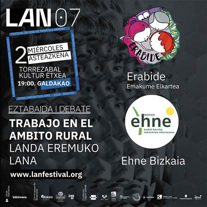- Landa-eremuko lanari buruzko eztabaida (urriak 2, Galdakao): Torrezabal Kultur Etxean egingo diren proiekzioen ondoren, Erabide Emakume Elkarteak moderatutako eztabaida bat egingo da. Elkarte horrek emakumeen garapena bultzatzen du, genero-ikuspegitik, bizitzaren eremu guztietan; alderdi pertsonala, lotura profesionala, familia-zaintza, aisialdirako eskubidea eta XXI. mendeko gizartean egiten duten lanaren garrantzia. EHNE-Bizkaia nekazal sindikatuaren partaidetzarekin, solasaldi honek elikadura subiranotasuna bultzatzearen garrantzia jorratuko du eta nekazaritza ekoizpen hurbil bat aldarrikatuko du, ingurumena eta klima errespetatuko dituen elikadura kalitatea eta osasungarritasuna bermatuko duena, enplegua eta landa ingurunearen bizitasuna sortzeko.
