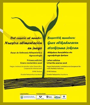 «Baserritik mundura: Gure elikaduraren etorkizuna jokoan» [Elikadura burujabetza eta agroekologia kurtsoa] Lehen edizioa: Urtarrila-azaroa 2016 > Klikatu hemen informazioa jasoteko: egutegia, metodologia, helburuak, ikerketarako ardatzak, irakaslegoa, prezioa, izen ematea, matrikulazioa, eta abar > Klikatu hemen izen emate orria eskuratzeko. > Informazio gehiago: www.hegoa.ehu.es Antolatzaileak: Hegoa Nazioarteko Lankidetza eta Garapenari Buruzko Ikasketa Institutua EHNE-Bizkaia «Del caserío al mundo: nuestra alimentación en juego» [Curso de Agroecología y Soberanía Alimentaria] Primera edición: Enero-noviembre 2016 > Información básica: Calendario del curso, metodología, objetivos,contenidos, ejes de investigación, profesorado, precio, fechas y proceso de inscripción y matriculación, etc: ¡Clicar aquí! > Para acceder a formulario de inscripción: ¡Clicar aquí! Más información en www.hegoa.ehu. Organizan: Hegoa instituto de estudios sobre desarrollo y cooperación internacional EHNE-Bizkaia Dekargatu: HEMEN/Descargar tríptico informativo del curso y otros materiales: AQUÍ