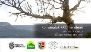 Ostirala, Ekainak 3 Otadiako Santo Kristo aterpetxea, Zelai kalea 91, Altsasu 17:00 – 17:30 Jardunaldien aurkezpena 17:30 – 18:00 Hitzaldi-eztabaida Komunalen gobernantza ona (Sergio Couto, iComunales). 18:00 – 19:30 Tailerra Herritarren partehartzea komunalen gobernantzan: egungo egoera eta etorkizunerako hausnarketak. Iortia Kultur Gunea. Frontoiko zeharbidea zg , Altsasu 20:00 Zinea La extraña elección (aukera arraroa)Dohako proiekzioa La extraña elección, 20:14 Iraupena 90 min. Herrialdea: Espainia Zuzendaria Carmen Comadrán. Produktorea :Tierravoz. Docs/ TPA. Generoa: Documental | Landa bizitza Web orria: http://www.tierravoz.com/laextranaeleccion/ Larunbata, Ekainak 4 Otadiako Santo Kristo aterpetxea, Zelai kalea 91, Altsasu 09:00 – 12:30 Komunalak Ekimenaren I. asanblada IKomunales Ekimena, Espainiar Estatuan zehar, ura, lurrak, baliabideak eta eskubide komunalak kudeatzen ditugun komunitateok osatzen dugu. Gure helburua, gobernantza sistema komunal hauen babes eta aitortza egitea da, eta modu berezian bere balore sozial, natural eta ekonomikoak babestu eta indartzea. 12:30 – 14:00 Tailerra (1. atala) Komunalak Ekimenaren lantaldeak. Lantalde tematikoen(basogintza, partehartzea, ikerketa,…) garapenerako…
