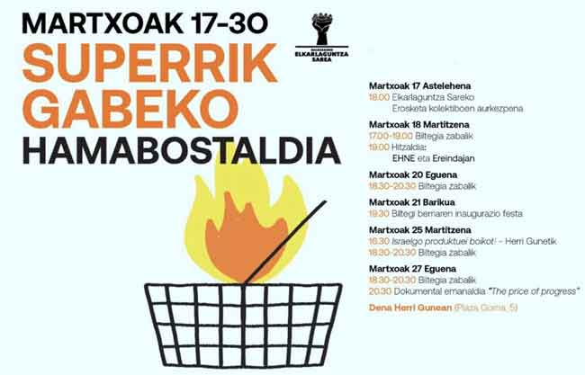 Erronka bota du Galdakaoko Elkarlaguntza Sareak: hamabost egunez supermerkatura ez joatea, hilaren 17tik 30era. Bitartean, alternatiba gisa, euren biltegia ireki diote jendeari, edonork erosi ahal izateko sareko kideek ekoitzitako eta elkarren artean erositako produktuak, sareko kide izan zein ez. Hain zuzen ere, ekintza horren bidez, agerian utzi nahi dituzte supermerkatuen eta korporazio handien salerosketen atzean dauden logikak. «Asko dugu hausnartzeko: zelan, non eta zer kontsumitzen dugun, eta zer dakarren horrek guztiak», esan du Mikel Sagarminaga Galdakaoko Elkarlaguntza Sareko kideak. Sagarminaga ogia eta beste elikagai batzuk erostera joan da Agirre Lehendakaria plazan ireki berri duten biltegira.