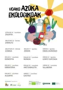 Uda honetako lehen azoka ekologikoa Zigoitian egin zen uztaila hondarrean, eta Zarautzen iragan berri da, abuztuaren 18an. Baina herritarrek badute aukera azoka hauetan goi mailako elikagaiak eskuratzeko, urria bitarte: Donostian (irailaren 2an), Errenterian (irailaren 9an), Algortan (irailaren 9an), Zerainen (irailaren 17an), Mungian (irailaren 30ean), Aretxabaletan (irailaren 30ean), Gasteizen (urriaren 7an), Eibarren (urriaren 8an), Durangon (urriaren 8an), Leintz-Gatzagan (urriaren 22an) eta Villabonan (urriaren 28an).