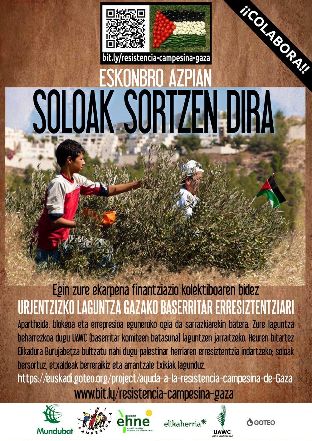 Mundubatek bertatik bertara laguntzen dio UAWC erakundeari; izan ere, haiek egunero borrokatzen dira Elikadura Burujabetzaren alde eta Palestinako herriak lurra, ura eta elikagai osasungarriak eta nahikoak izateko duten eskubidearen alde. Une honetan oso blokeatuta daude eraildako ahaideak eta lagunak lurperatzen, baita errefuxiatuei eta zaurituei laguntzen ere. Hasierako bidalketa medikamentuak eta larrialdiko laguntza ematera bideratuko da, eta bigarrengo bat nekazarien antolakuntza eta erresistentziari laguntzeko. Gazako zerrendako hainbat familiak beren etxebizitzak galdu dituzte, eta familiakoen etxeetan eta Gazako agintariek eta Nazio Batuen sistemak prestatutako aterpeetan bilatu behar izan dute babesa. Gazako biztanleei egindako erasoen ondorioz galera handiak izan dira zerrendako nekazaritza-eremuetan: fruta-arbolak (%25), baratzeak (%30) eta bertako beste soro eta partzelak, Gazako elikadura-beharren %80 estaltzen dutenak[01]. Arrantza-lanetan ere ondorio larriak izan dira etengabeko erasoengatik, profesionalak hil eta ontziak eta lanabesak suntsitu dituztelako. Gazako familiei epe laburrean laguntza eman ezean, herritarren elikadura ez da bermatuta egongo, eta, gainera, Israelek 2006tik inposatutako blokeoaren ondorioak are okerragoak izango dira. [01] Oharra: gerra-egoeraren beraren ondorioz, kalteen ebaluazioa behin-behinekoa da. Informatzen jarraituko dugu, egoeraren berri izan ahala.