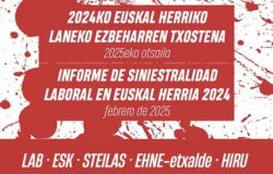 ↓ Descargar Informe ↓ Los sindicatos LAB, STEILAS, ESK, EHNE, HIRU y el movimiento Etxalde han hecho público el Informe sobre Siniestralidad Laboral en Euskal Herria correspondiente al año 2024. El informe muestra que los datos de siniestralidad del año 2024 superan los del año 2023. Esto se debe, entre otros factores, a que no se han adoptado medidas efectivas para evitar los accidentes laborales, por lo que se mantiene la tendencia de años anteriores. Durante los últimos años la clase trabajadora de Euskal Herria está sufriendo las consecuencias del declive y la privatización de los servicios públicos. Los servicios públicos no se han desarrollado adecuadamente, y ahora, en lugar de reforzarlos, los partidos políticos que gobiernan las instituciones de…