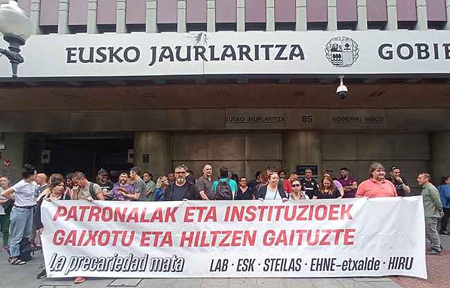 Los sindicatos LAB, ESK, STEILAS, EHNE, HIRU y el movimiento Etxalde se han concentrado esta mañana ante la sede en Bilbao del Gobierno Vasco para denunciar los últimos accidentes laborales, que esta semana se han cobrado cuatro nuevas víctimas.