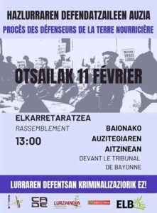 El 11 de febrero, 3 defensores de la tierra serán juzgados en Baiona tras una protesta colectiva en el Ayuntamiento de Kanbo el 10 de abril de 2024, en protesta por la negativa del alcalde de esa localidad de Iparralde a entablar cualquier diálogo sobre el caso Marienia. Las organizaciones Cade, ELB, Lurzaindia, Nahi Dugun Herria y OSTIA han convocado movilizaciones para ese mismo día a las 13:00 horas frente al Tribunal.
